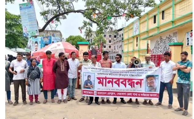 A human chain program was held at the Central Shaheed Minar premises on Friday at 11 am in protest and demanding punishment. Journalist Md. Shamim Talukder, president of Bangladesh Press Club Mymensingh Divisional Committee, presided over the human chain program organized by Bangladesh Press Club Netrokona District Branch. Journalists Md. Monayem Khan, Kazi Shafiul Alam Chowdhury Jewel, journalist Asaduzzaman Talukder, lecturer and journalist Bijoy Das, poet Shamsuddoha Farid, Ed. Zahirul Islam Rana, journalist Tanjila Akhter Ruby, poet Durjoy Sheikh, poet and journalist Abdus Samad, journalist Md. Manik Mia, and journalist Md. Obaidul Islam Sagar spoke at the human chain. The human chain program was conducted by lecturer and journalist Sumon Ahmed, convener of Bangladesh Press Club Barhatta Upazila branch, in the presence of dignitaries and journalists. It is noteworthy that journalist Mohiuddin Talukder, who was the victim of torture and attack, is undergoing treatment at Netrokona District Sadar Hospital and a complaint has been filed at Netrokona Model Police Station in this incident.