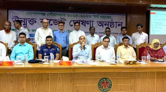 An open budget of Tk 558.5 million has been announced for the 2025-2026 fiscal year of Gopalganj Municipality, without imposing any additional taxes on the consumer level, especially on municipal holding tax, building construction fees, trade license renewal, water bills, and any services provided by the municipality. Gopalganj Municipal Administrator and Deputy Director (Deputy Secretary) of the Local Government Department, Biswajit Kumar Pal, announced the budget at the conference room of Gopalganj Municipality on Monday (June 23) afternoon. The budget has estimated income of 278.5 million 37 thousand taka and expenditure of 274.5 million 71 thousand 361 taka. The surplus in this budget is estimated at 39 lakh 65 thousand 639 taka. Several development works have been undertaken in the coming fiscal year, including the construction and supply of modern water treatment plants in the municipal area, waste management, development of roads and drainage systems, provision of lighting on various roads in the municipal area, and mosquito control activities. Municipal Administrator Biswajit Kumar Pal has expressed hope that the civic amenities of Gopalganj residents will increase if these projects are implemented. At this time, he requested the residents of the municipality to pay municipal taxes, water bills, and other financial sector fees on time. Gopalganj Municipality Executive Officer AHM Rakibul Islam moderated the open budget announcement and special guests included Additional Superintendent of Police (Finance and Administration) Muhammad Sarwar Hossain, Gopalganj Municipality Performance Support Committee Member (Ward 3 and 4) Civil Surgeon Dr. Abu Said Mohammad Faruk, Member (Ward 10) Deputy Director of the District Women’s Affairs Department (Retd.) Lakhsana Lucky, Member (Ward 5 and 6) Deputy Director of the District Agricultural Extension Department A. Kader Sardar, Member (Ward 12 and 13) District Education Officer Md. Ruhul Amin, Member (9 and 21) District Primary Education Officer Md. Jyotsna Khatun, Gopalganj Municipality Executive Engineer Md. Mehedi Hasan. In addition, the problems and suggestions of people from all classes and professions present in the open discussion on the budget were noted. At that time, Gopalganj Sonali Bank Main Branch Manager KM Mahmud Ali, Police Inspector Matiar Rahman, Social Development Officer Md. Zulfikar Ali Mollah, TLCC Women Members, Conservancy Officer Md. Emran Hossain Mollah, Personal Assistant to the Municipal Administrator Mahfuzur Rahman Lablu, Acting Administrative Officer Naru Gopal Sarkar, Municipality Accounting Officer Sumanta Kumar Biswas, Cashier Biraj Kumar Biswas, Accounting Assistant Rawshan Habib Sumon, other officials and employees of the Municipality, media workers working in various print and electronic media in the district, and civil society leaders were present.