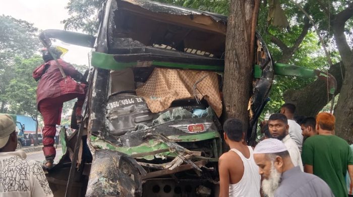 A man named Azgar Ali (24) was killed in a head-on collision between a bus and a truck in Gazaria, Munshiganj. At least 11 bus passengers were injured in the incident. The accident occurred in the Anarpura area of the Dhaka-Chittagong highway at around 1:15 pm on Monday (July 7). The deceased, Azgar Ali, was the son of the late Alauddin of Char Falkon village in Kamalnagar upazila of Noakhali district. He was working as a helper on the bus that met with the accident. The names of 11 people among the injured were immediately known. They are Hasan (26), Shah Jalal (60), Ahsan Ullah (55), Zahid (31), Saymon (14), Shahin (35), Sohag (30), Sagirul (50), Abu Said (55), Limon (24), and Halima (52). Among the injured, Saymon, Sohag and Hasan have been sent to Dhaka Medical Hospital for advanced treatment. It is learnt that on Monday around 1:45 pm, a freight truck driver lost control while taking a U-turn through the Anarpura bus stand area and overturned after hitting a road divider. At that time, the driver of a passenger bus of the fast-moving Jonaki Paribahan from Noakhali to Dhaka tried to push the bus to the left to avoid a collision with the truck, but it hit a tree on the side of the road. The front part of the bus was twisted and several people were trapped inside. In the incident, bus helper Azgar Ali died on the spot. Local people and fire service personnel rescued the injured and sent them to the Upazila Health Complex. Dr. Saad Karim, a doctor at the emergency department of Gazaria Upazila Health Complex, said, “Eight people injured in this incident were brought to our hospital. Three of them, Saimon, Sohag and Hasan, are in critical condition. We have sent three of them to Dhaka after giving them primary treatment. The rest are being treated at this hospital.” Regarding the matter, Md. Shawkat Hossain, in-charge of Gazaria Highway Police Outpost, said, “One person was killed and several others were injured in this incident.” The body of the deceased is currently at the police station. The vehicles involved in the accident have been removed from the highway, traffic is normal. Legal action is under process.