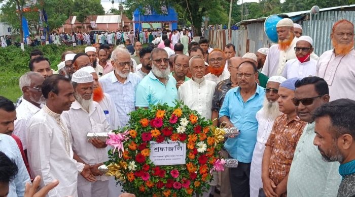 Netrokona celebrates the historic Nazirpur Battle Day. People from all walks of life commemorated the martyrs in various programs, including laying wreaths at the shrine of the seven martyrs in Kalmakanda, Shimanto Upazila. On Saturday (July 26) from 12 noon, on the occasion of the annual Day of Justice, the district upazila administration and freedom fighters command paid tribute to the martyrs by placing flowers at the tomb of the martyrs in Fulbaria near the border pillar of Lengura Union in Kalmakanda Upazila. Netrokona Additional District Magistrate (ADM) Sukhmoy Sarkar, former MP and former president of the district nationalist party BNP, freedom fighter Ashraf Uddin Khan, Kalmakanda Upazila Executive Officer Faizul Wasima Nahat, Kalmakanda Police Station Officer-in-Charge (OC) Mohammad Lutfar Rahman, freedom fighters and people from different walks of life paid tribute to the martyrs. Later, after the guard of honor was given to the martyrs, a minute of silence was observed to pay respect to the martyrs and prayers were offered. Freedom fighters from the district, local and different areas came to this. Along with this, the general public from political, social and cultural organizations paid their respects by offering flowers. Earlier, the administration and freedom fighters paid tribute by placing flowers at the memorial built at the Nazirpur battlefield in the upazila. It is noteworthy that on this day, doctors Abdul Aziz and Fazlul Haque of Netrakona, Yar Mahmud of Muktagachha, Mymensingh, Bhabatosh Chandra Das, Nuruzzaman, Dwijendra Chandra Biswas and Jamal Uddin of Jamalpur were martyred in the frontal battle by the Pakistani occupying forces. Each person is buried near the boundary marker, Pillar No. 1172.