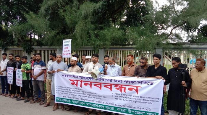 Koyra (Khulna) Correspondent A human chain was held to demand a seven-point solution to the health service crisis facing the people of Koyra, the most remote and inaccessible coastal upazila