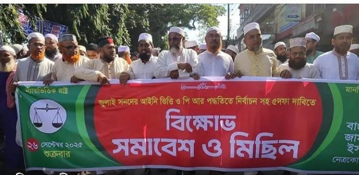 A protest rally was held on Friday afternoon after Friday prayers by the District Jamaat-e-Islami, organized by the Bangladesh Jamaat-e-Islami Netrakona District Branch, demanding the legal basis of the July