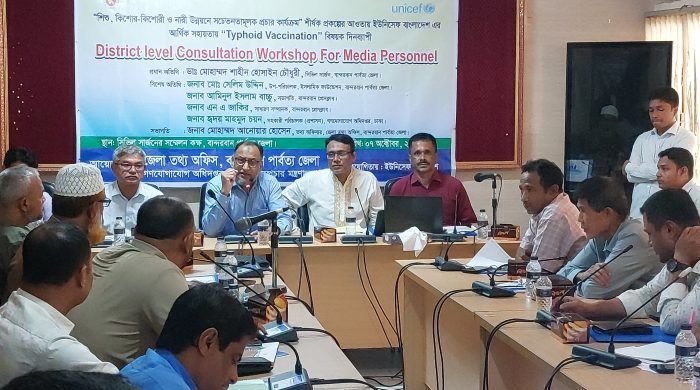 A day-long “Orientation Workshop” on Typhoid Vaccination held with journalists in Bandarban.The workshop was held on Tuesday (October 7) at the District Civil Surgeon Conference Room.The Bandarban District Information Office