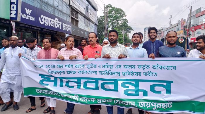 Yesterday at 10 am, a human chain and protest rally was held in Joypurhat on the town’s main road with the initiative of the Islami Bank Customer Forum demanding the
