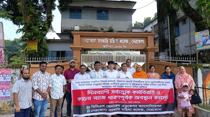 A strike and sit-in program has been observed in Netrakona, like the rest of the country, in protest against the attack on respected teachers, officials and regular meritorious students of