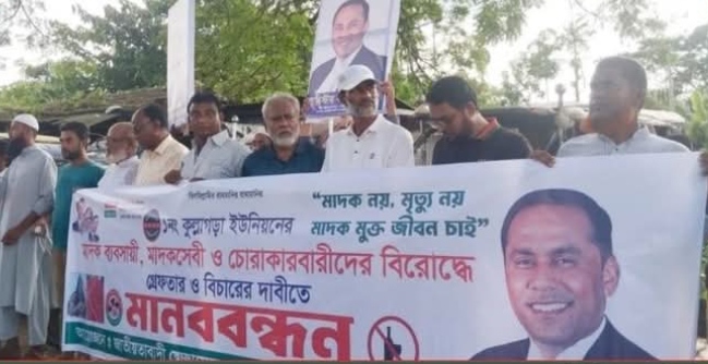 A human chain has been formed in Durgapur Upazila of Netrokona demanding the arrest and trial of drug dealers, drug users and smugglers to eradicate them. Human chain was held