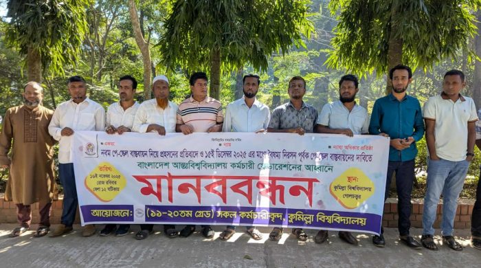 Employees of Comilla University-(CoU) in grades 11 to 20 formed a human chain on Sunday (16 November) protesting what they described as discrimination and deception in the implementation of the