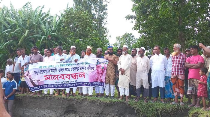 Locals have formed a human chain in Ratanpur area of Oriya Union in Fulchhari upazila of Gaibandha demanding protection of homes and agricultural land from erosion of Brahmaputra River. The